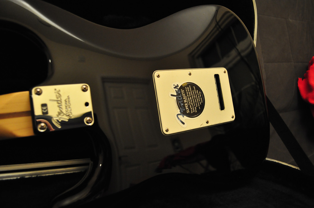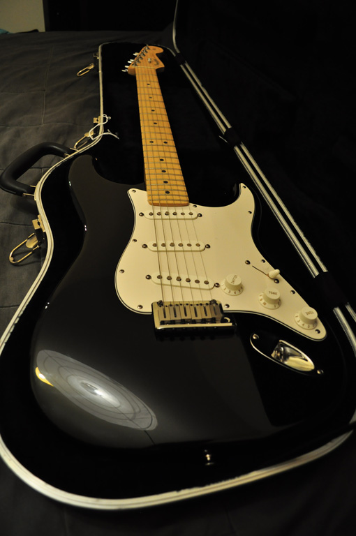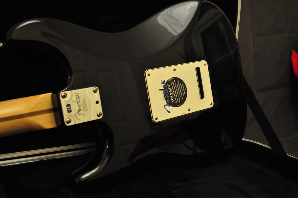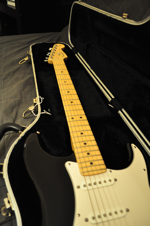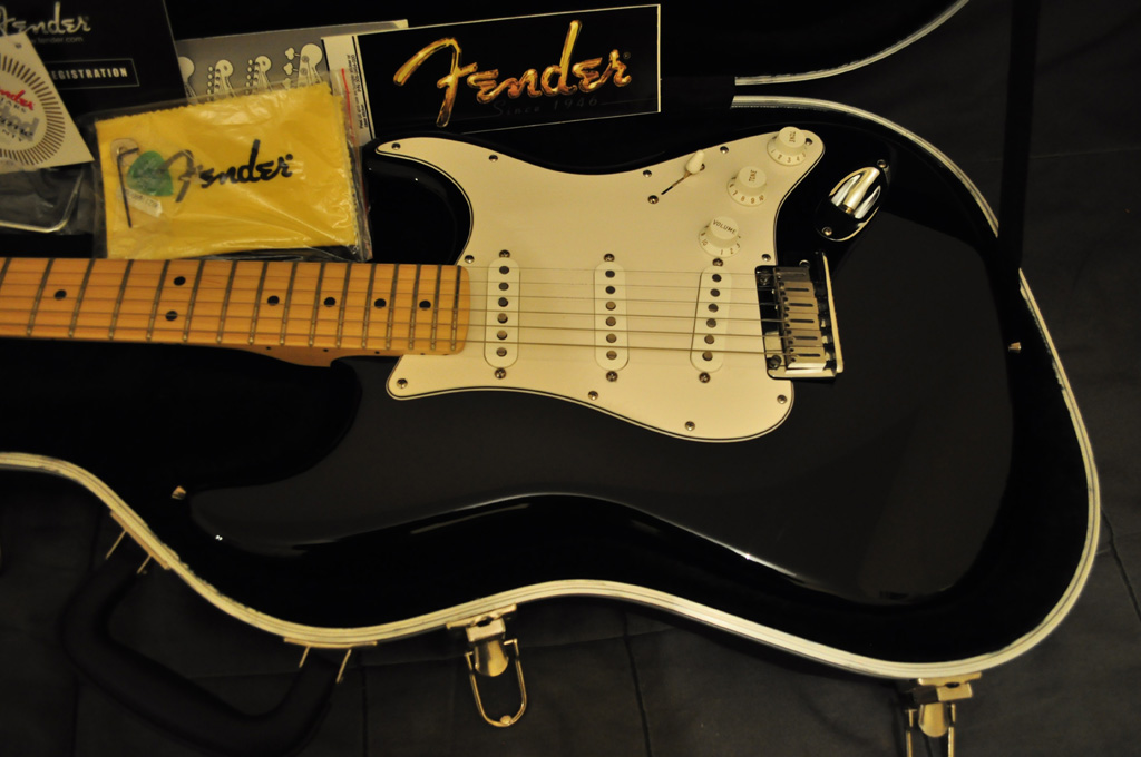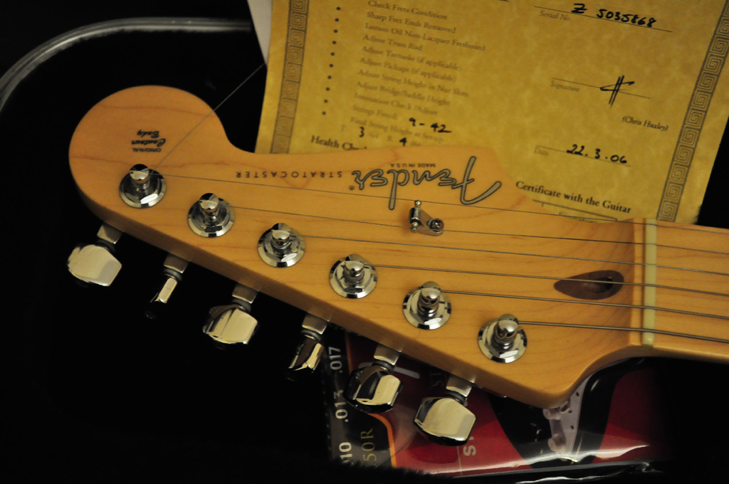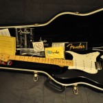 This is a 2005 Fender American Standard Stratocaster, completely Eric Clapton’s Blackie look. It’s a really classic looking and sounding guitar. It’s got a nice resonant alder body and a gorgeous maple neck with a great looking grain and fantastic low action (it was set up by a really famous luthier who was worked for Brian May etc, certificate included). It was built in 2005 but it’s in BRAND NEW, UNUSED condition! Just have a look at the pictures! There are no scratches, damages or dents on it, comes with the never used tremolo arm and the original hard case and candy…