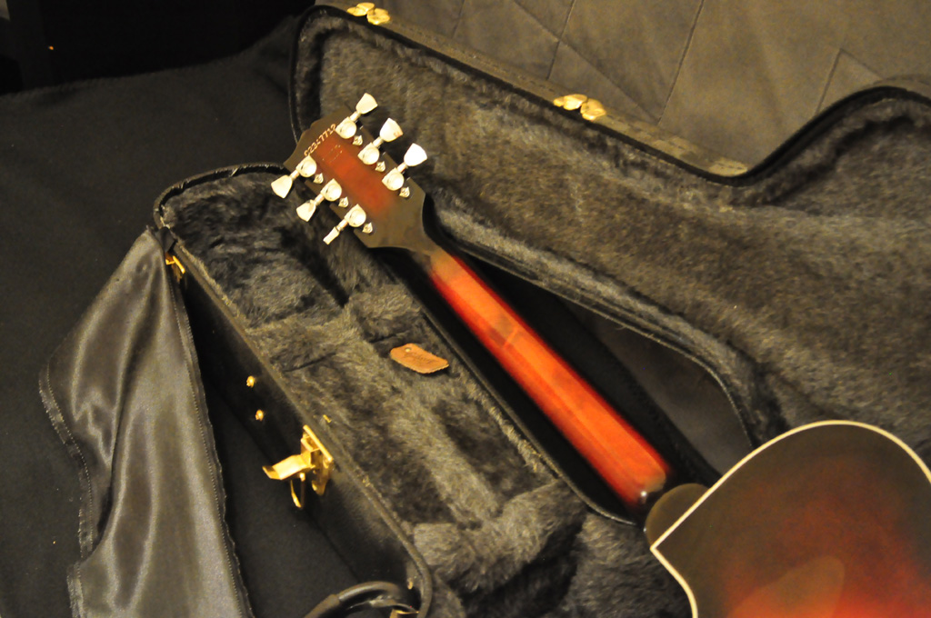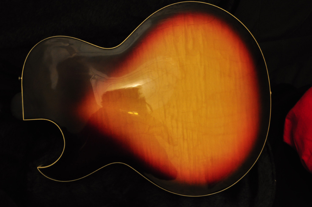 The body is made of Curly Laminated maple on the top, back and rims with a multi-ply cream colored binding on the top and a single ply binding on the back. The Bridge is a Nashville TOM with stopbar tailpiece.