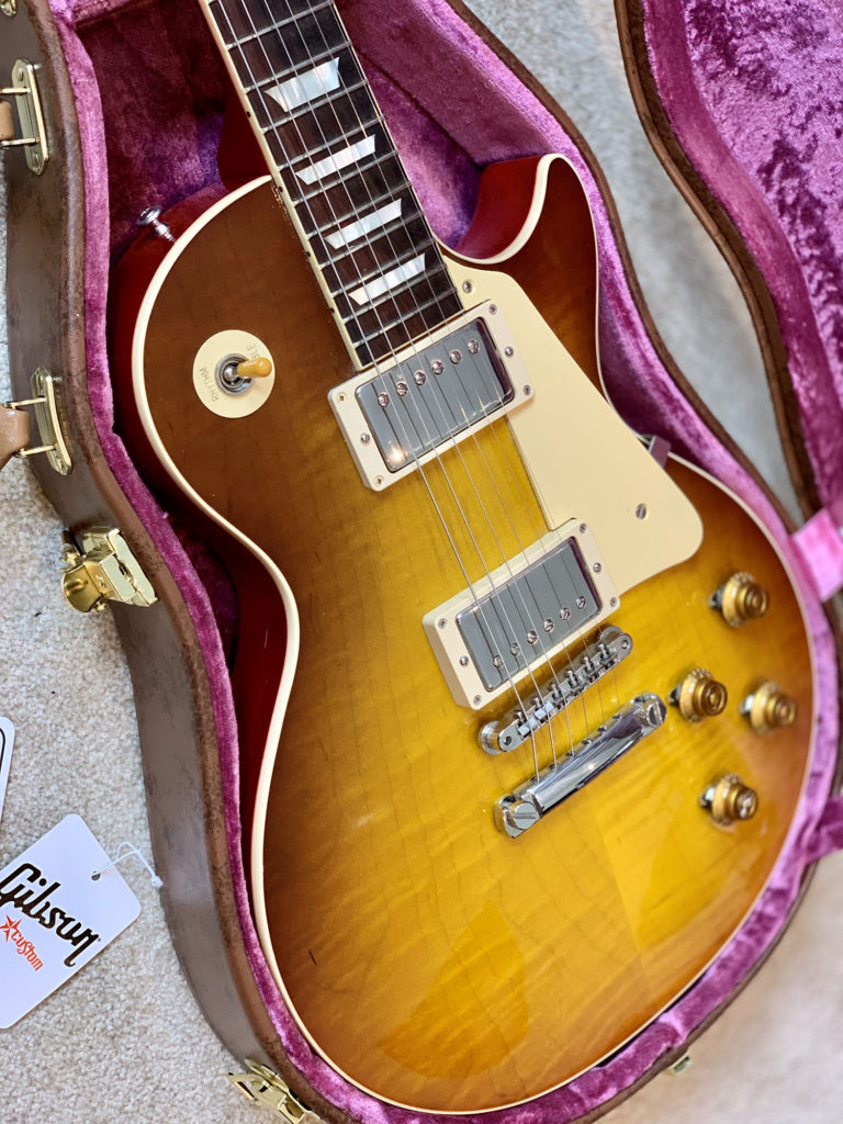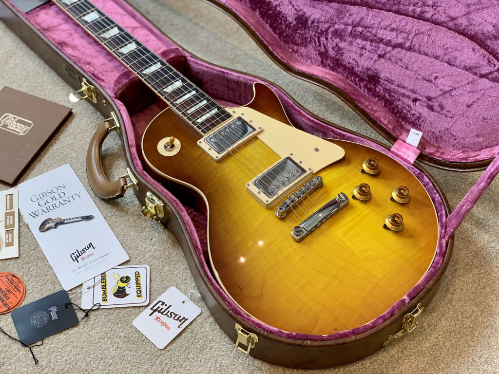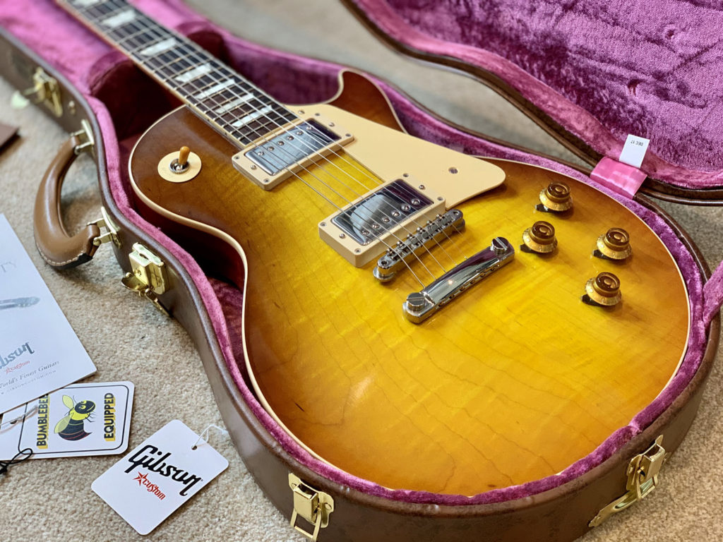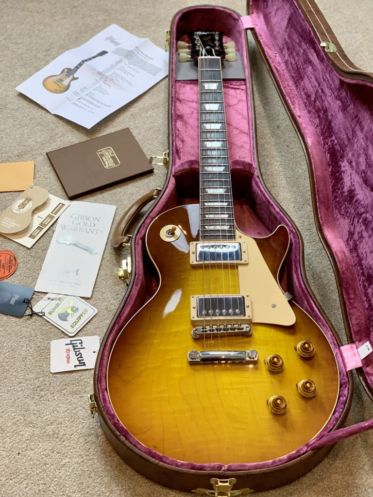 We all know that these post 2013 made Custom Shop Les Pauls are just amazing guitars. From 2016 they also used all the TRUE HISTORIC plastics from the top of the range True Historic / Collectors Choice models on these guitars! Amazing quality, fantastic specs, great upgrades: new Custom Bucker pickups, period correct finishes, aniline dye, long neck tenon…all what we want.